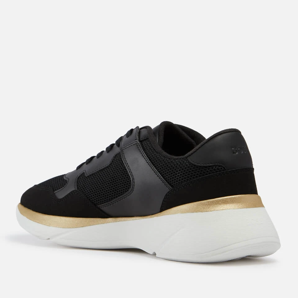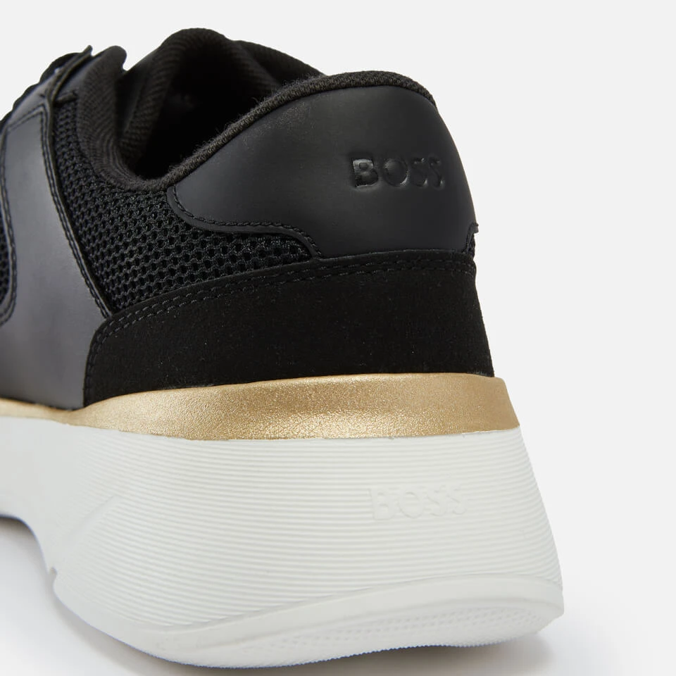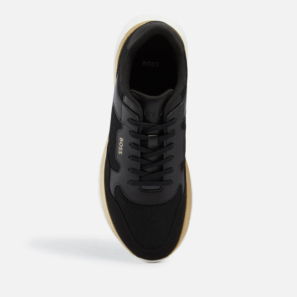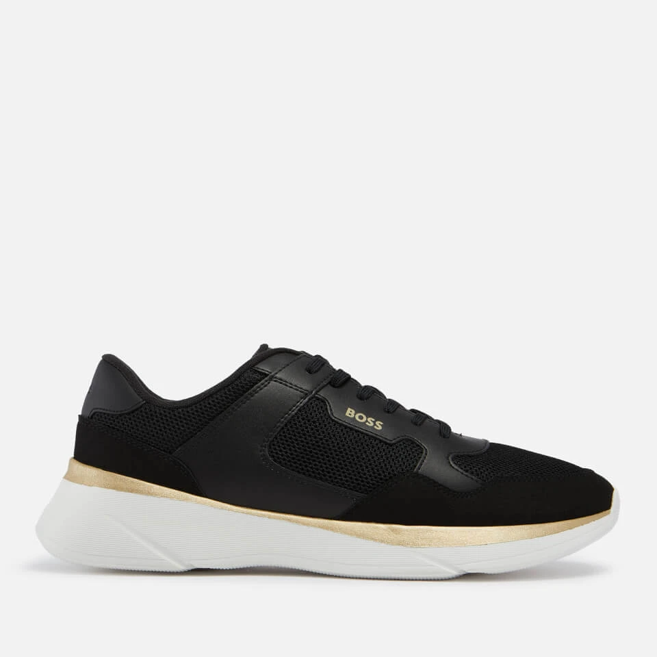 Crafted into a retro-style silhouette, BOSS’ Dean runner trainers are rendered from black mesh with smooth bonded leather trims for a slightly elevated touch. The design is supported with a raised sole and features the label’s ubiquitous logo on the tongue and counter.
