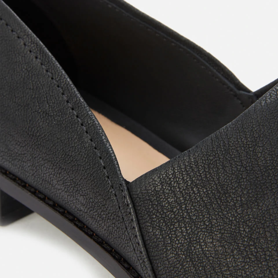 Smooth black leather mules by Clarks with a simple slip-on design. The flats have a round toe and a slim black rubber sole with a small heel. An Eco Foam footbed and a leather lining combine to offer long-lasting comfort. A gold foil Clarks logo on the footbed completes the versatile flats.