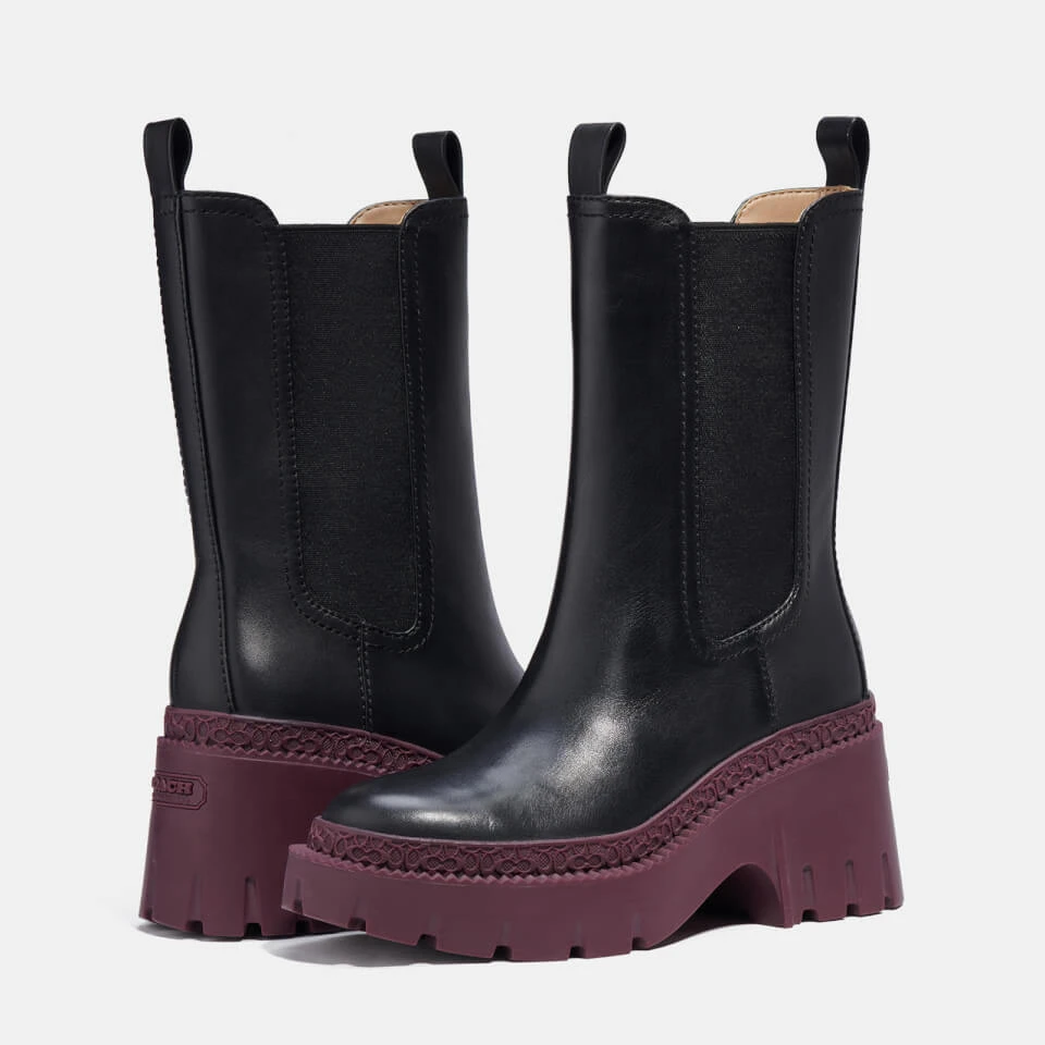 Coach rejuvenates the classic Chelsea boot for the new season. Cut from polished black leather, they honour the traditional silhouette with elasticated sides and dual pull tabs. Meanwhile, chunky mulberry-tone rubber soles with a signature-embossed welt serve autumnal newness.