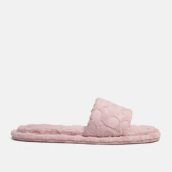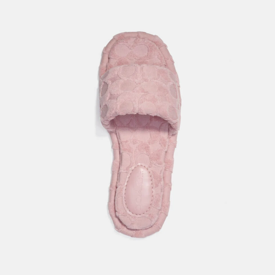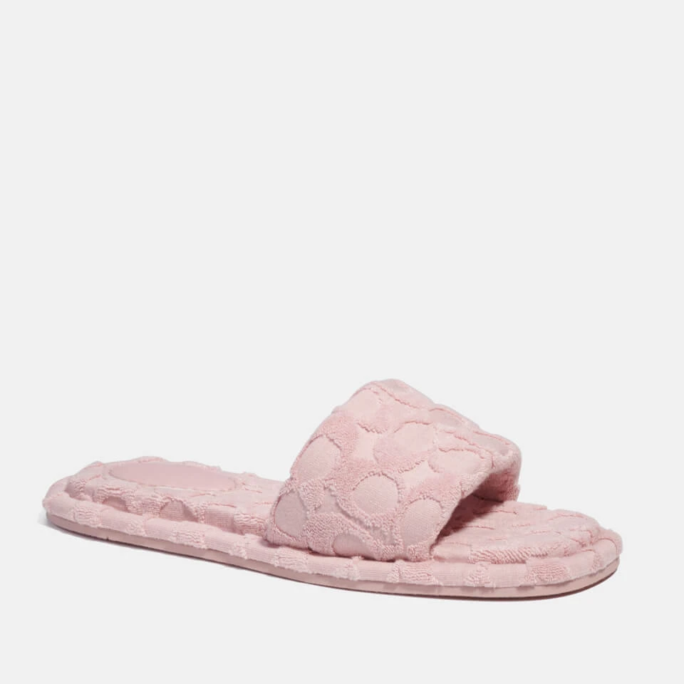 Coach redefines our expectations of the classic slide sandal with the Bridgett sliders. Swapping out rubber for plush signature-adorned Terry cloth, the blossom pink pair are just as suitable for lounging at home as they are wondering about town.