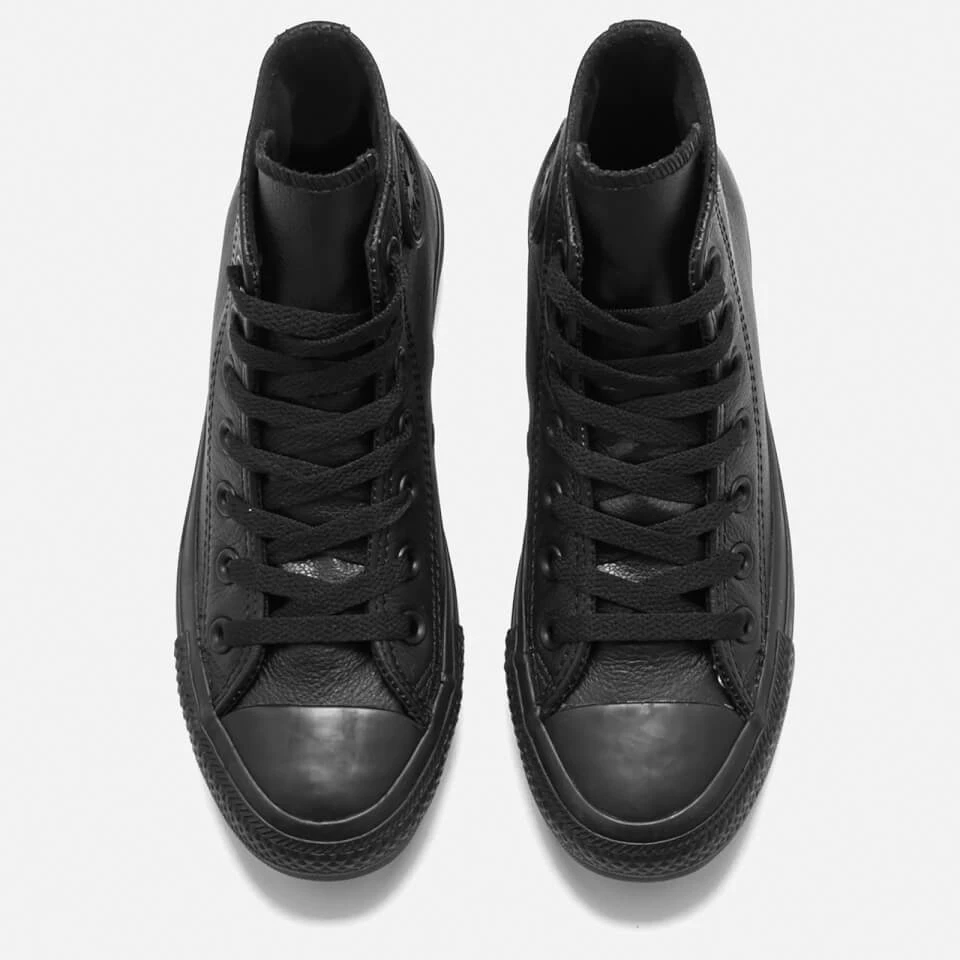 Unisex ‘Chuck Taylor All Star’ hi-tops from Converse with black leather upper and tonal rubber sole. A signature design, the trainers feature a lace up front with rubber toe cap and tonal stitches. Complete with iconic embroidered patch to the inside and metal eyelets. – K.N.