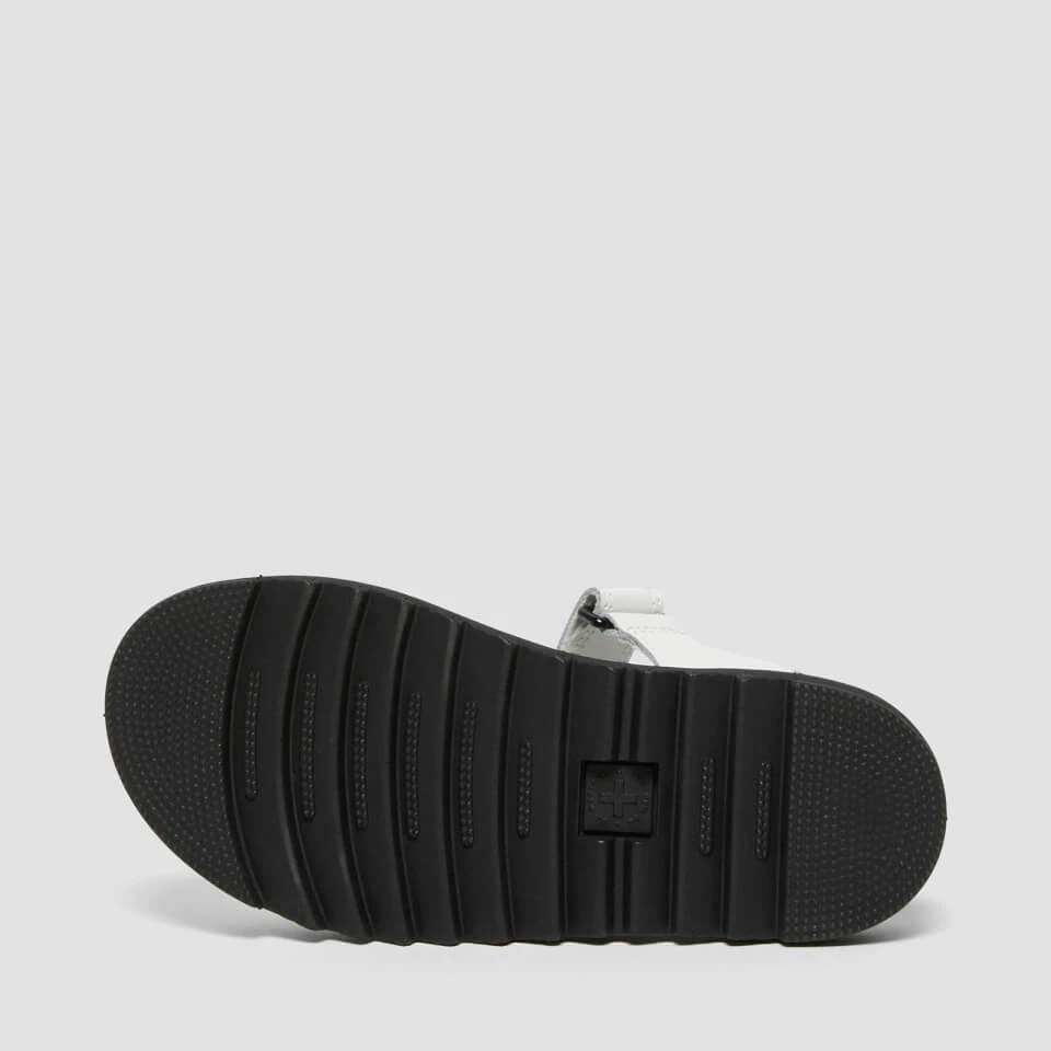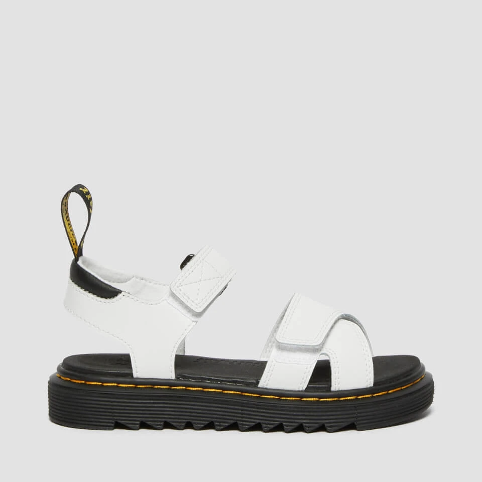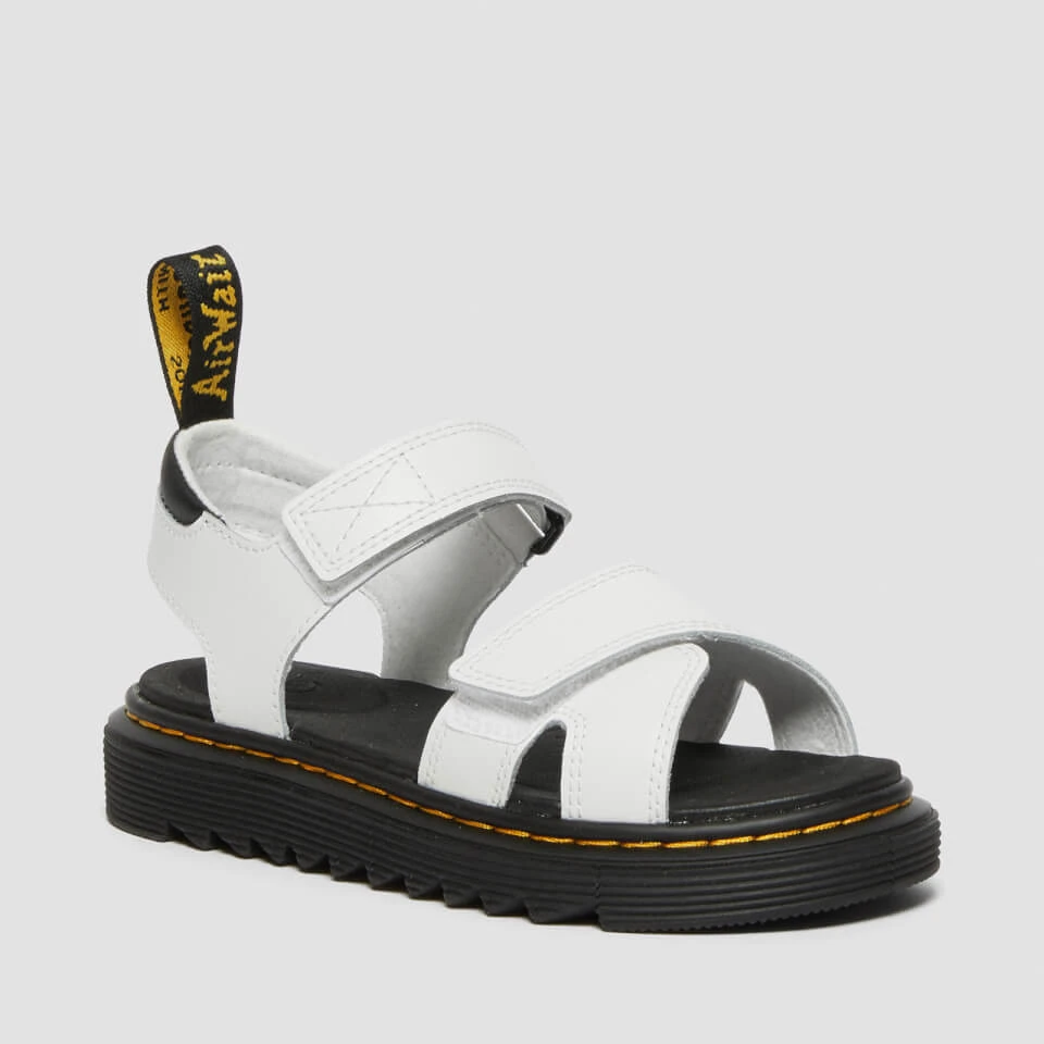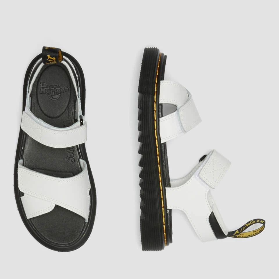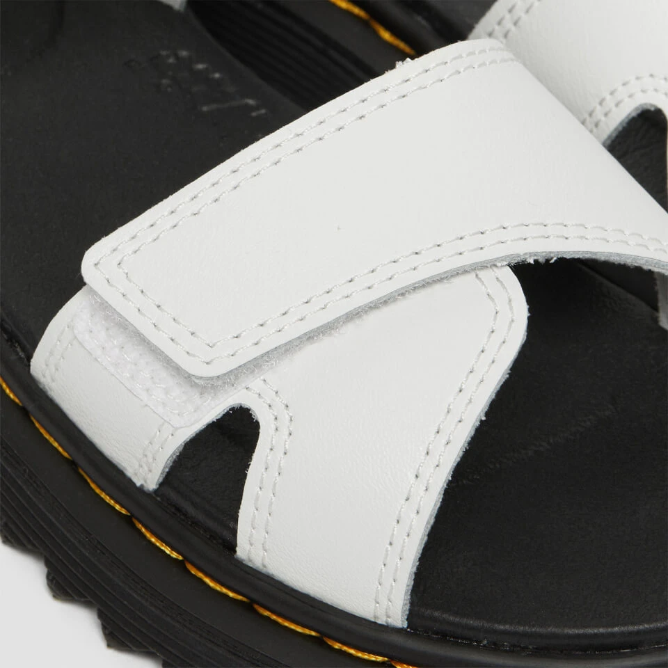 A mini revamp of Dr. Martens Voss II sandals, the Vossie Lampers are crafted from white leather with crisscrossed straps. Effortlessly fastening with Velcro®, the pair rest upon a chunky, yellow-stitched sole for signature attitude.