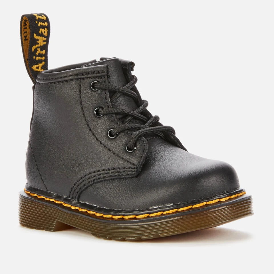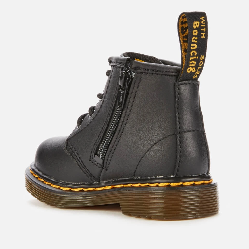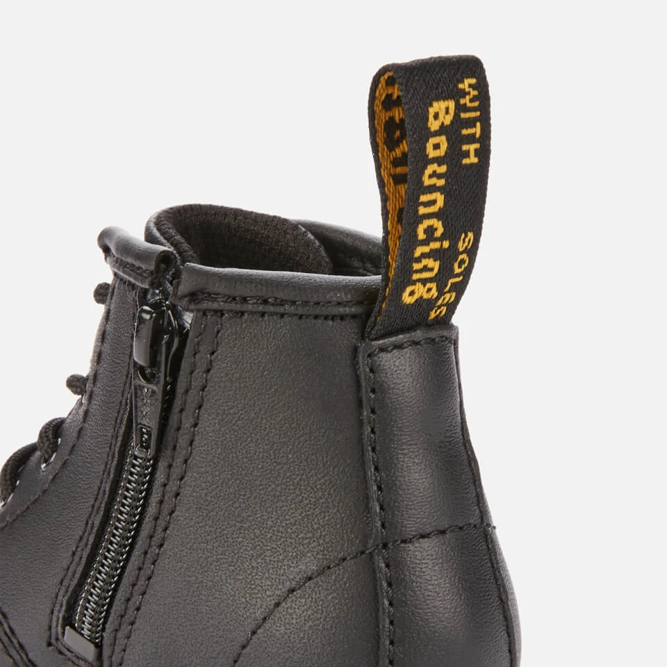 Dr. Martens toddlers’ 1460 leather boots in black. Smooth finish. Contrasting black lace-up fasten. Iconic chunky sole. Branded pull tab to the rear. Zip fasten to the side.
