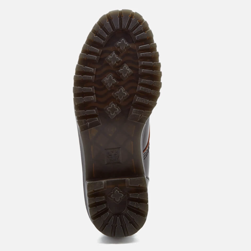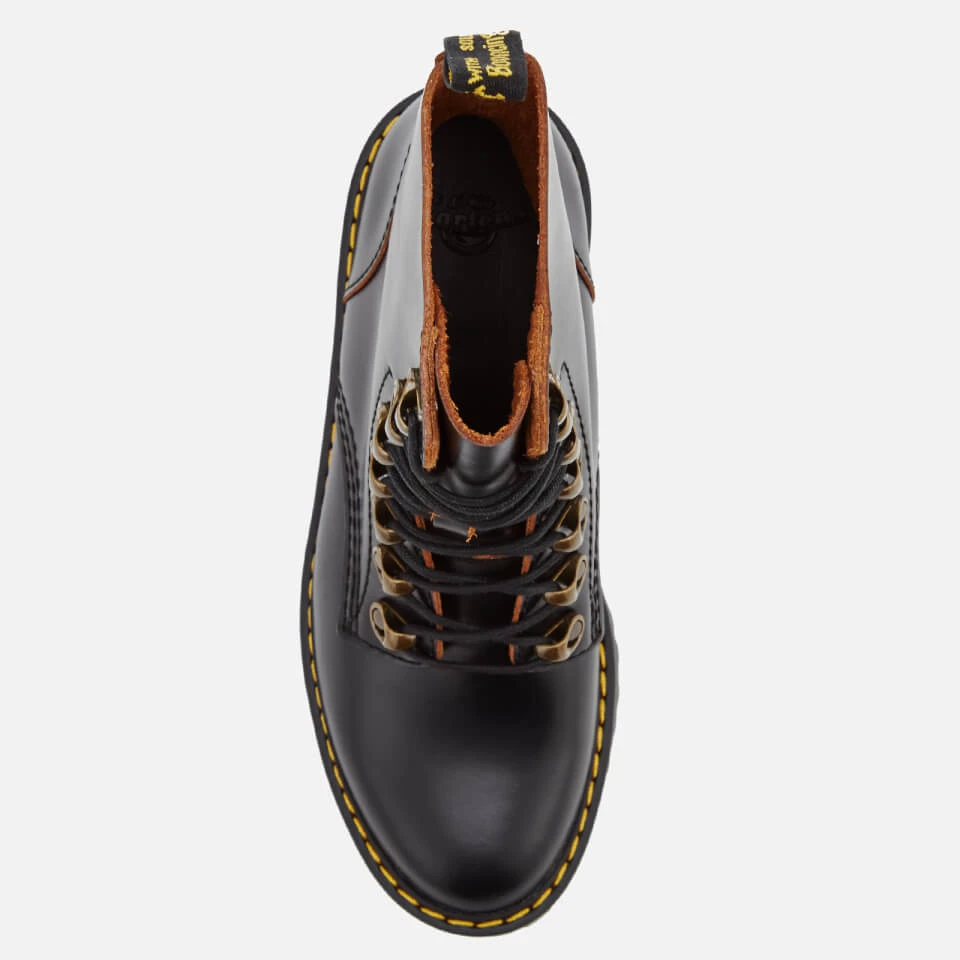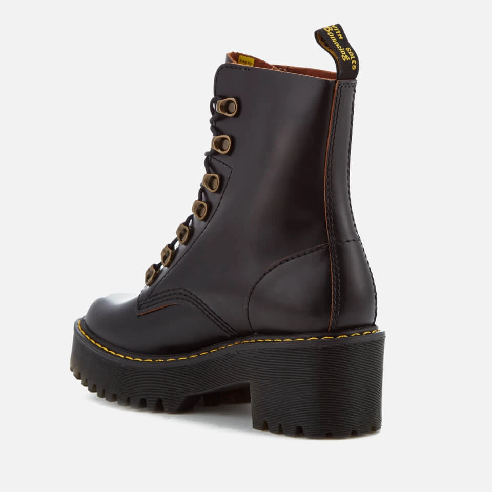 Women’s heeled ankle boots from Dr. Martens. Crafted from the brand’s ‘Vintage Smooth’ leather, a retro version of their signature smooth leather, the ‘Leona’ boots showcase a sleek yet rugged upper with a rounded toe, lace-up fastening with antiqued brass tunnel eyelets, and signature scripted heel pull for entry assistance. Set upon an AirWair™ air-cushioned sole with platform sole, chunky heel and commando tread. The sole has been constructed by stitching it to the base of the upper and insole, and is oil, fat and slip-resistant. Contrast yellow stitching adds a signature finish to the design.