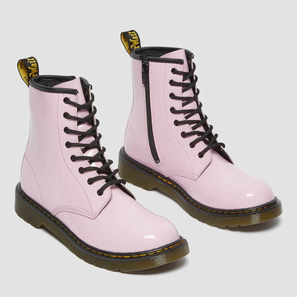 The pale pink 1460 Dr. Martens for toddlers keep all the original details of the original 8-eye boot with the addition of a side zip for easy access. Made from a coated Patent Lamper leather for a high-shine finish. The Goodyear welt soles are reinforced with the signature yellow stitching and topped with an AirWair heel loop.