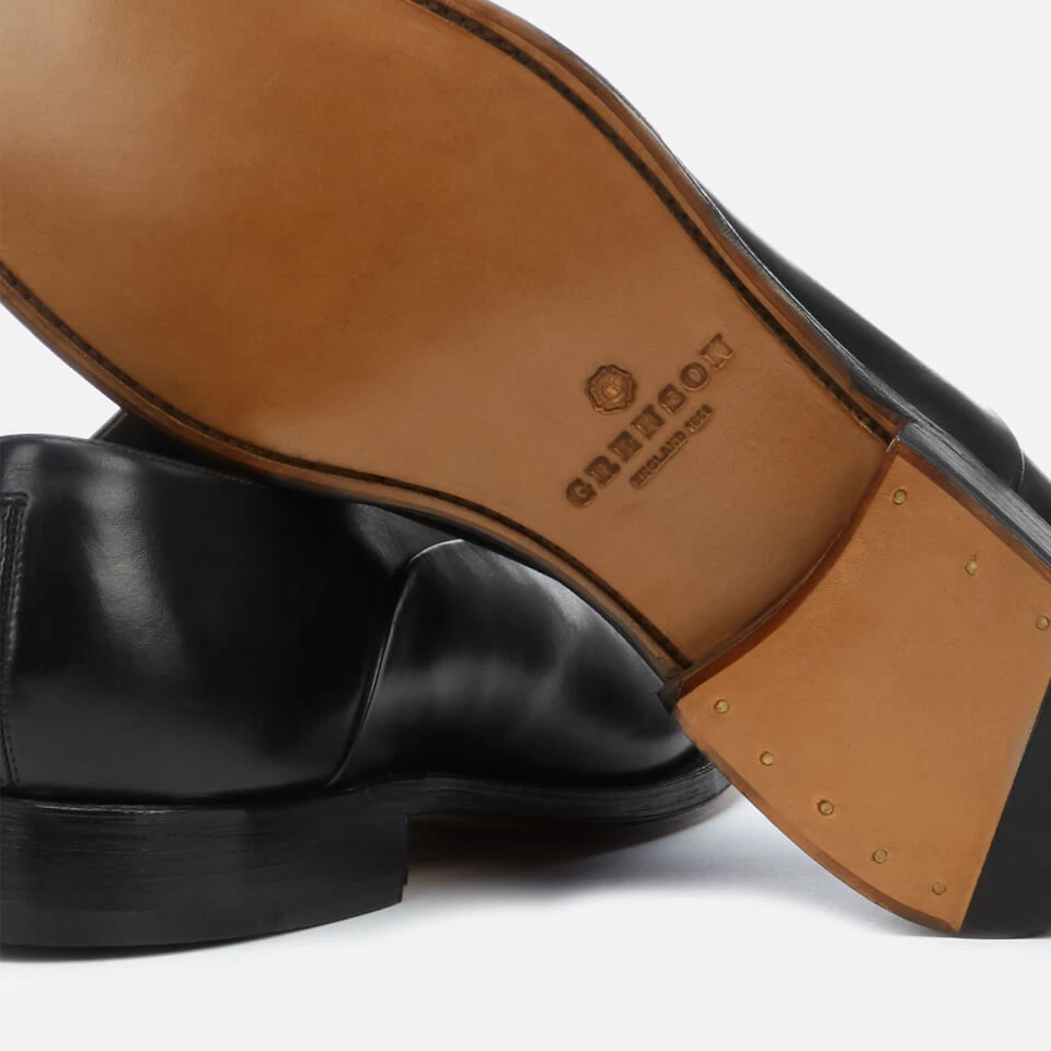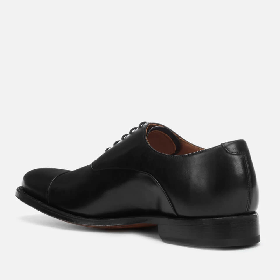 Men’s ‘Bert’ leather Oxford shoes from British footwear brand, Grenson. Crafted with panels of smooth, luxurious calf leather, the black brogues feature a rounded toe, a front lace-up fastening and visible stitching at the midsole. A Goodyear Welted leather outsole with slight heel ensures superior traction and durability.