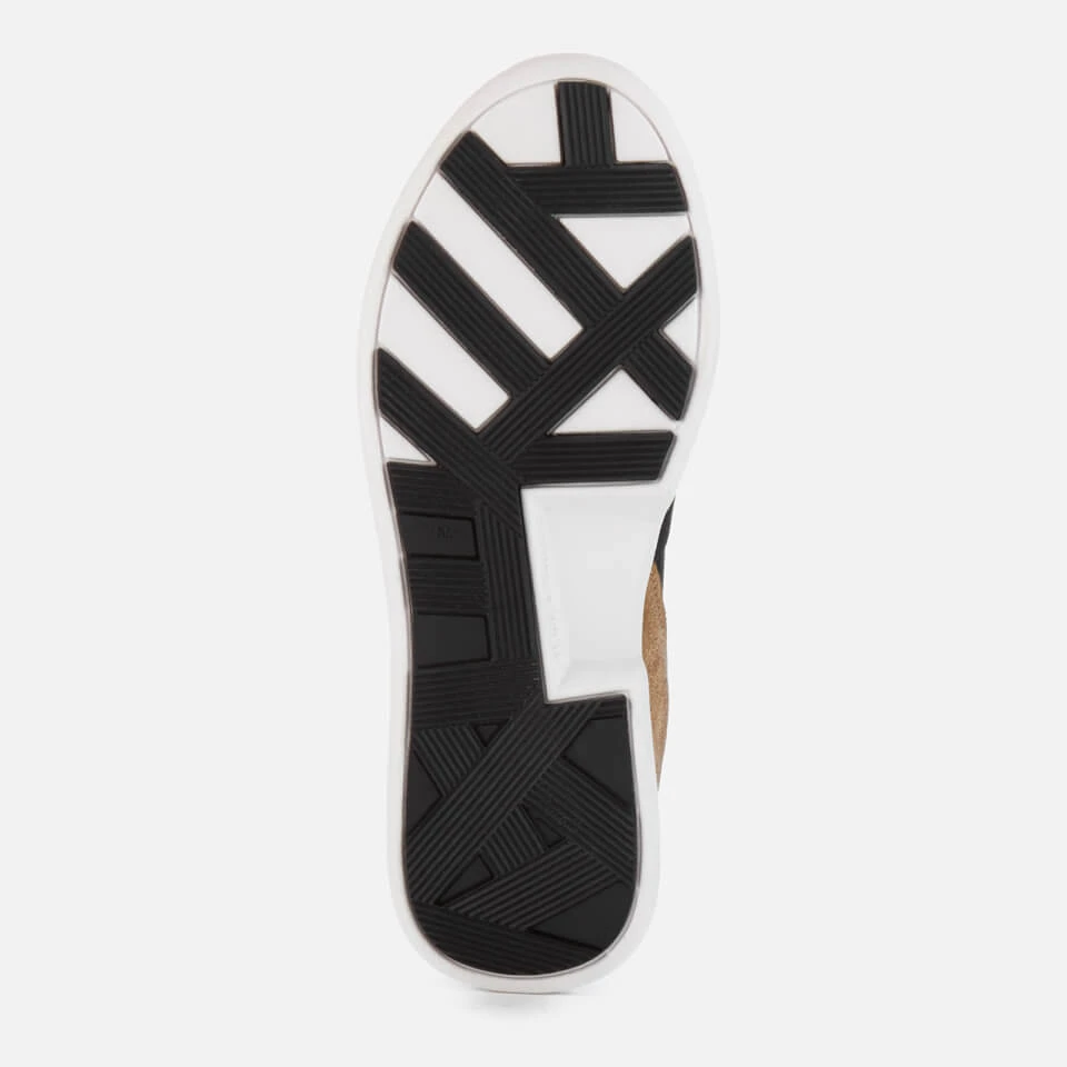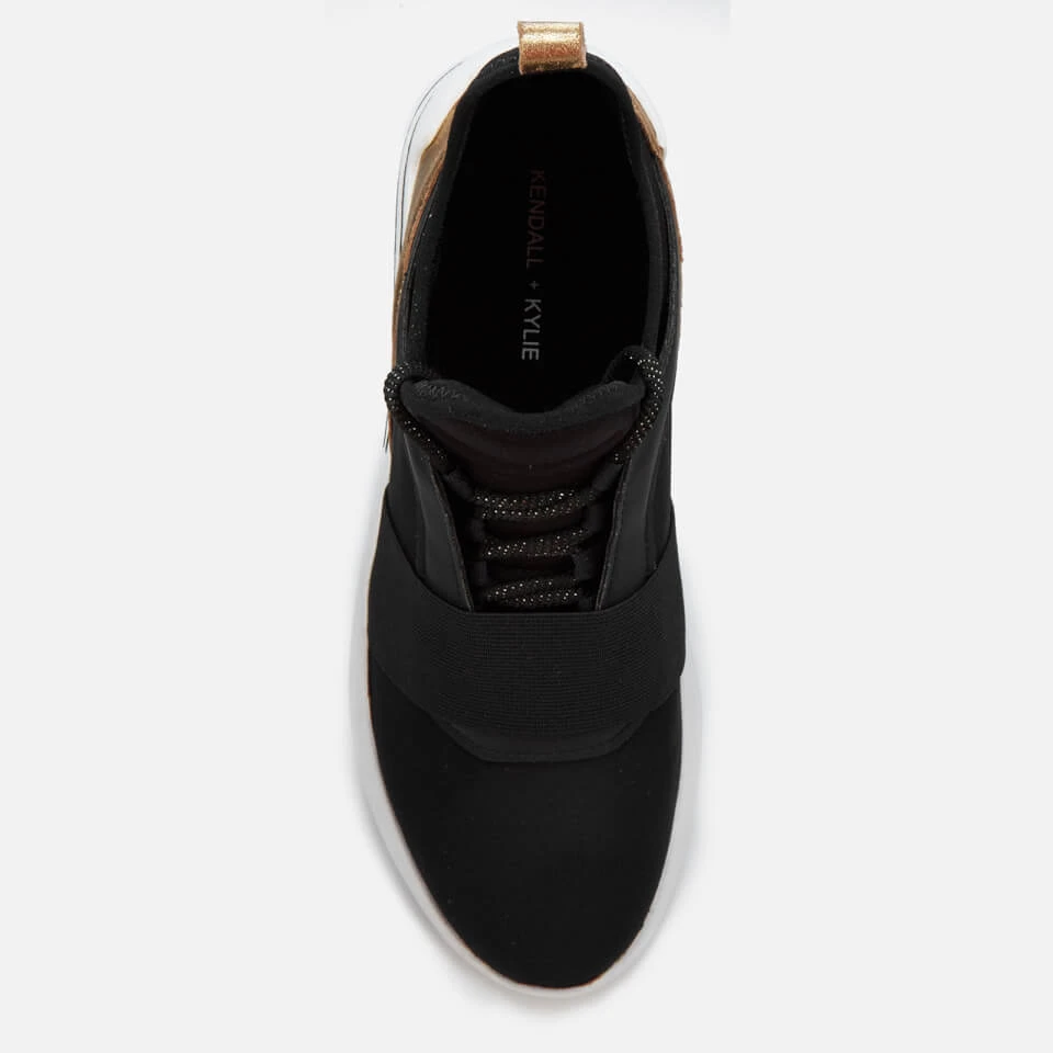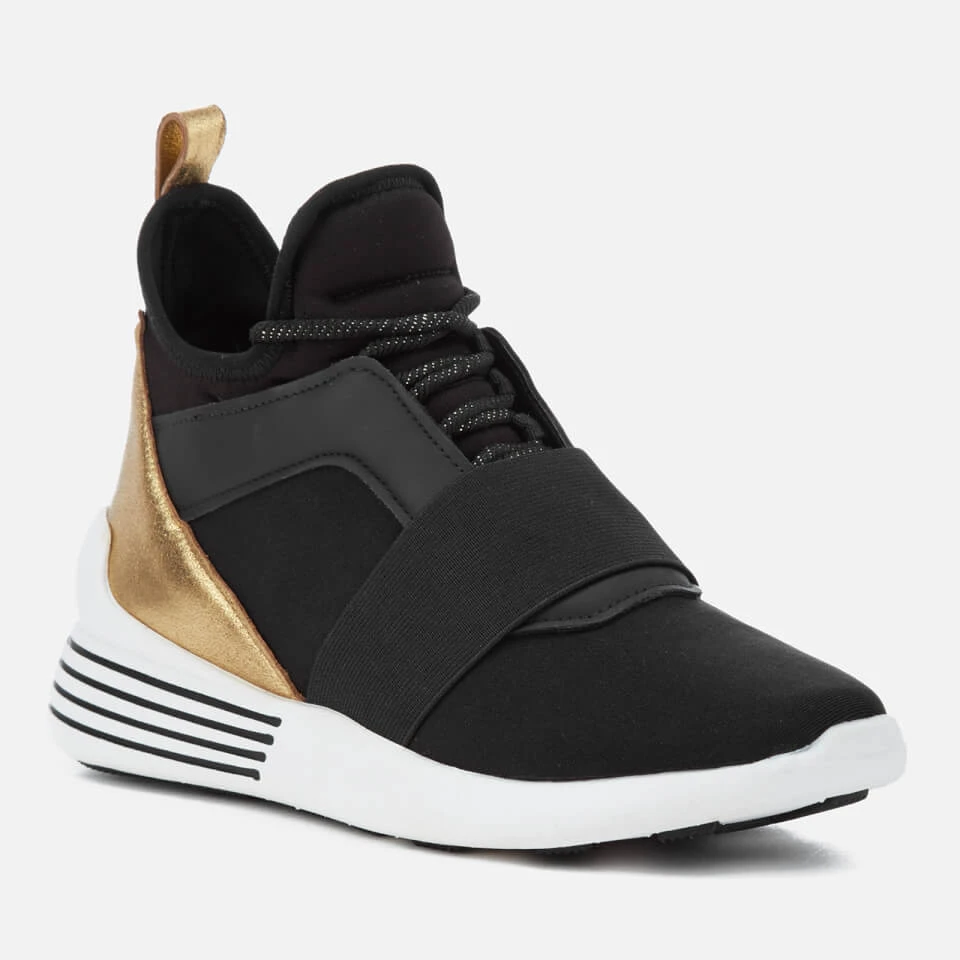 Kendall + Kylie black neoprene high top trainers with gold-tone, metallic leather on the heel and black leather detail on the vamp. Crafted with a padded neoprene sock liner, the sports-inspired ‘Braydin’ sneakers feature a lace fastening and an elasticated strap across the midfoot. Set on a wedge sole, the trainers are finished with cut out stripes on the midsole, a heel pull tab and a textured outsole.