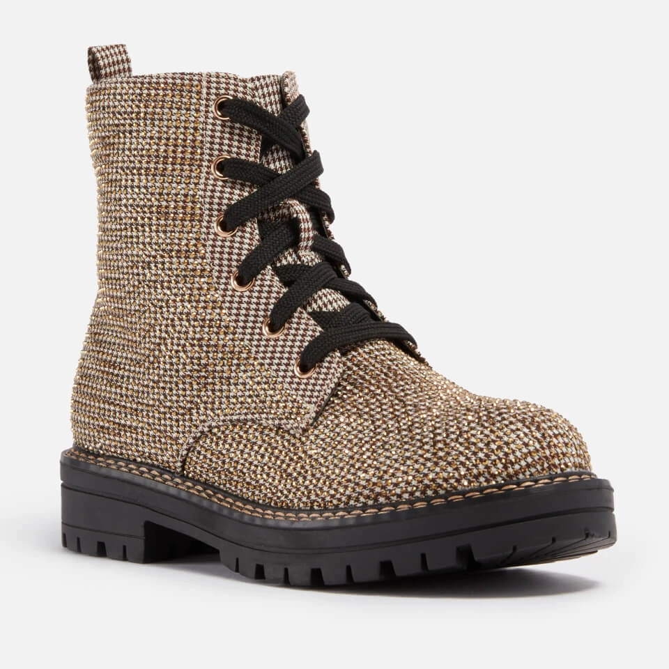 - Pull tabs, gold-tone eagle plaque, gold-tone diamanté embellishments, chunky rubber soles