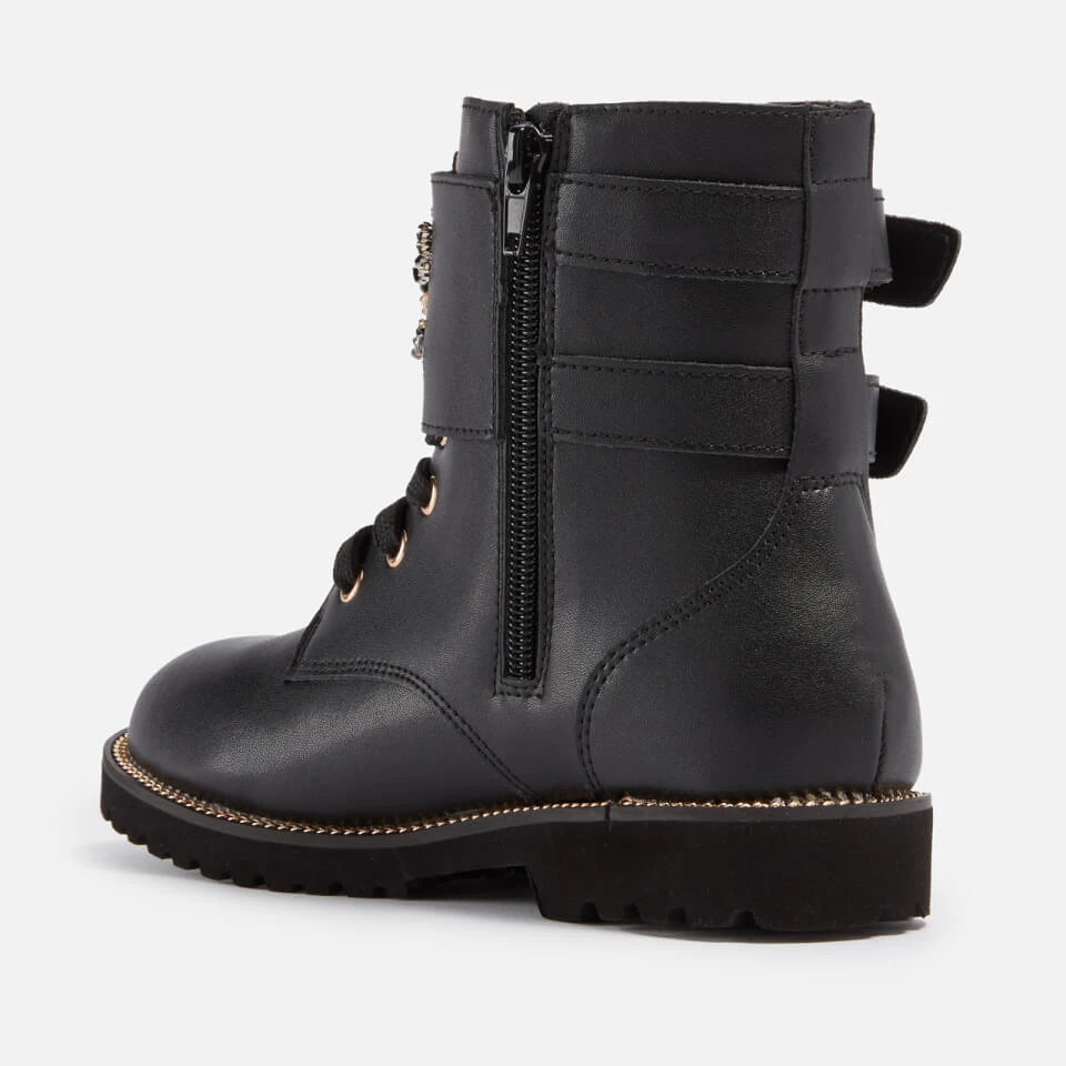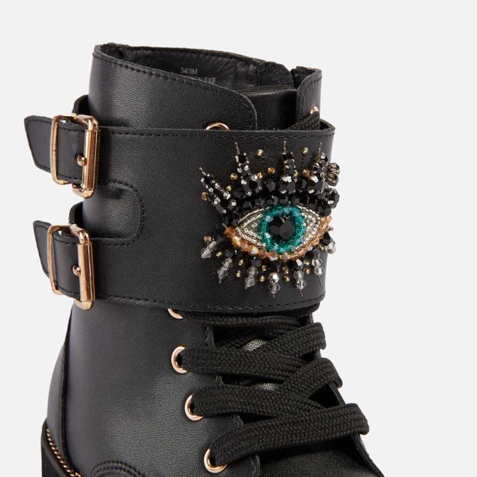 - Eye-embellished buckle straps, gold-tone hardware, rubber soles