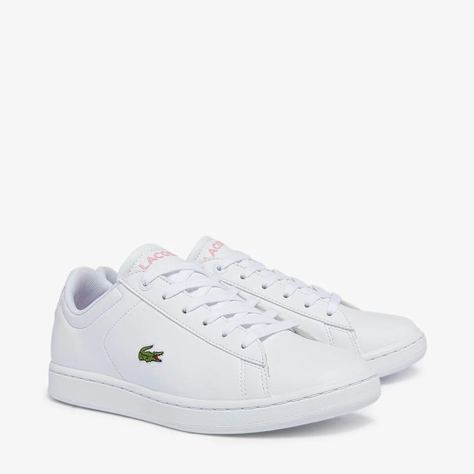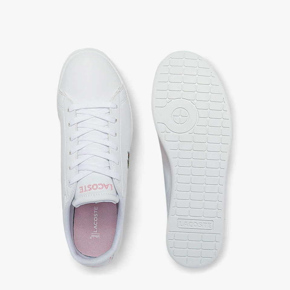 Lacoste’s white Carnaby Evo trainer arrives in a slim cupsole silhouette with breathable mesh lining for comfortable all-day wear. It is enhanced with the label’s iconic logo in appliqué detail on the quarter along with soft pink embroidered lettering on the top of the design.