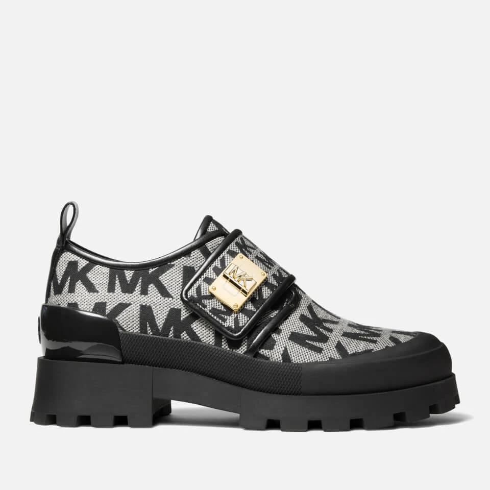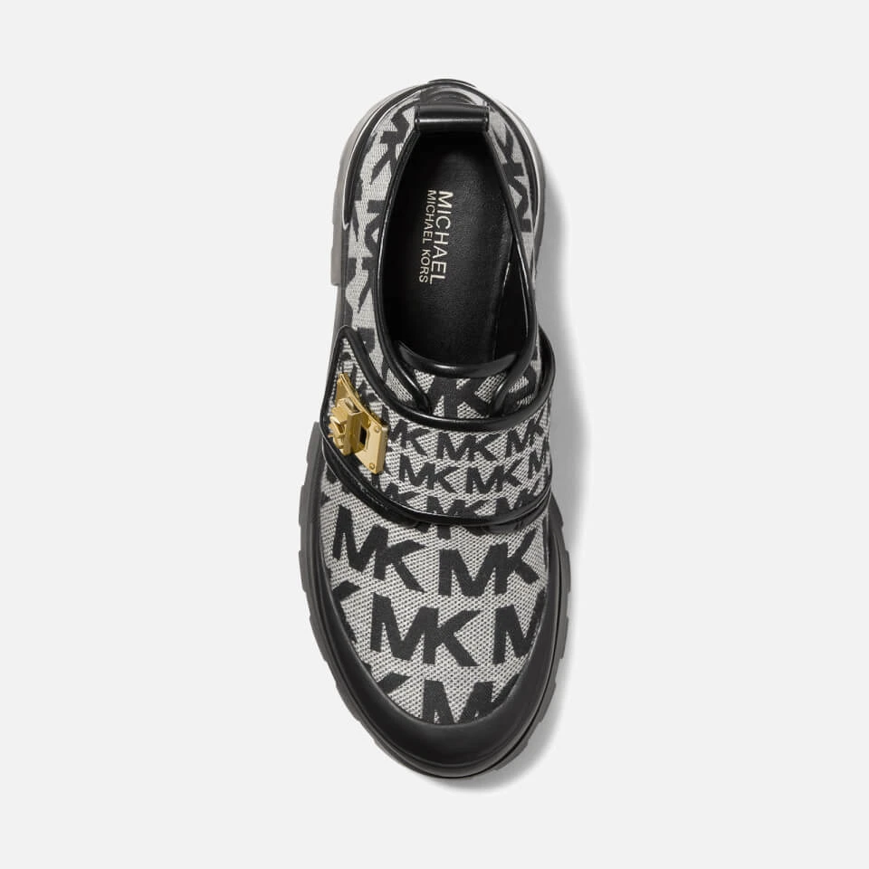 - Pull tabs, designer logos, foot strap, gold-tone hardware, rubber soles, cleated soles