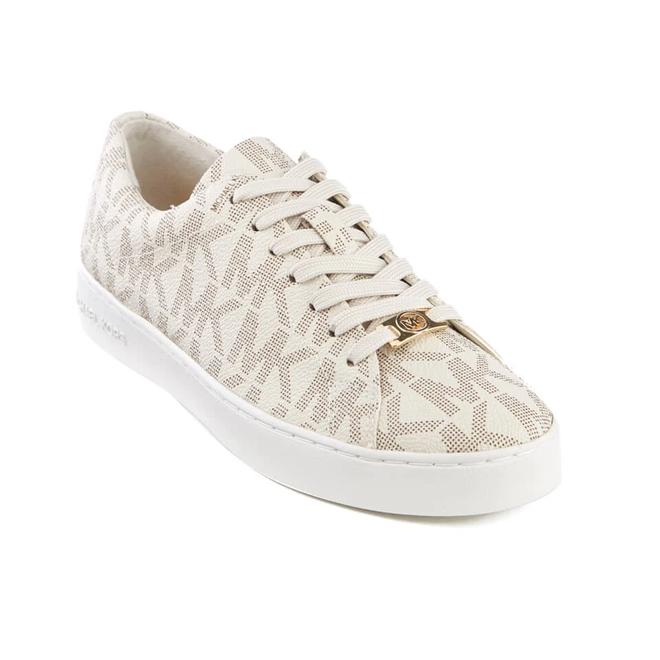 Women’s white ‘Keaton’ trainers with an all over ‘MK’ monogram print from MICHAEL MICHAEL KORS. Crafted from textured PVC, the lace fastened sneakers are detailed with a metal ‘MK’ lace locker and a logo engraved stud on the heel. Set on a contrast white rubber sole, the round toe sneakers are finished with signature branding on the heel, a textured outsole for added grip and a leather insole for comfort.