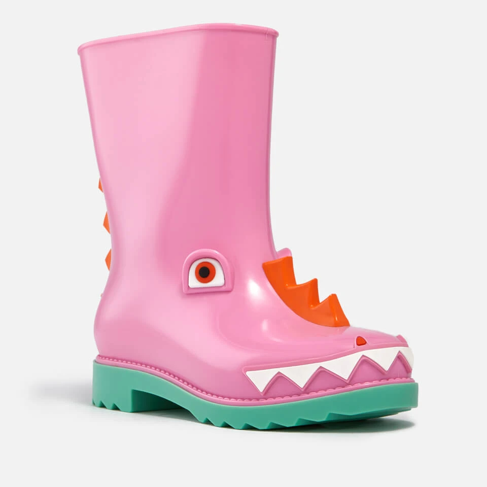 - Orange dino spikes, appliquéd eyes and teeth, soft foam footbeds, green rubber soles, scented
