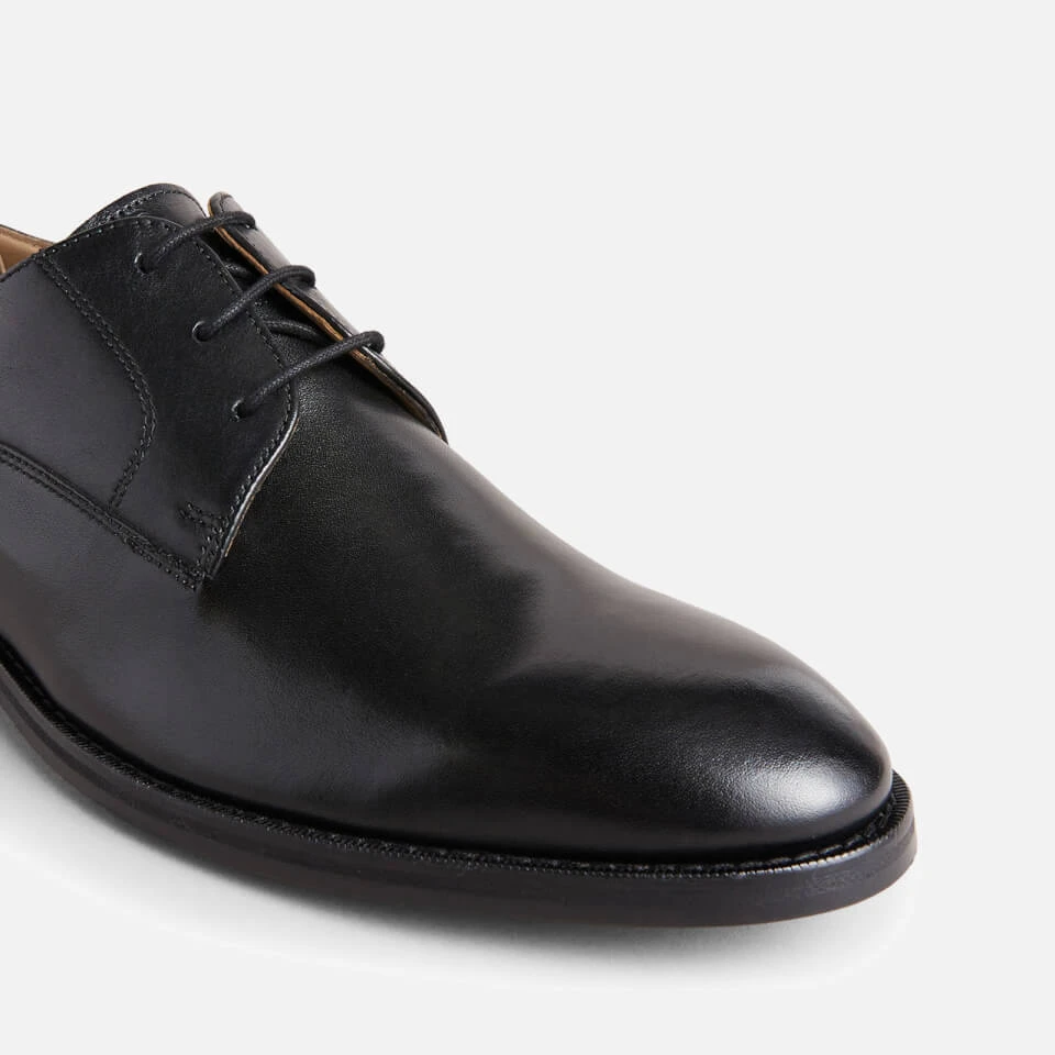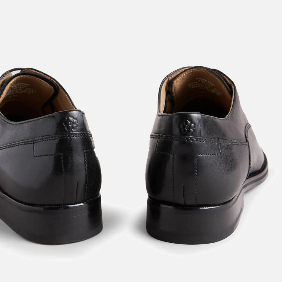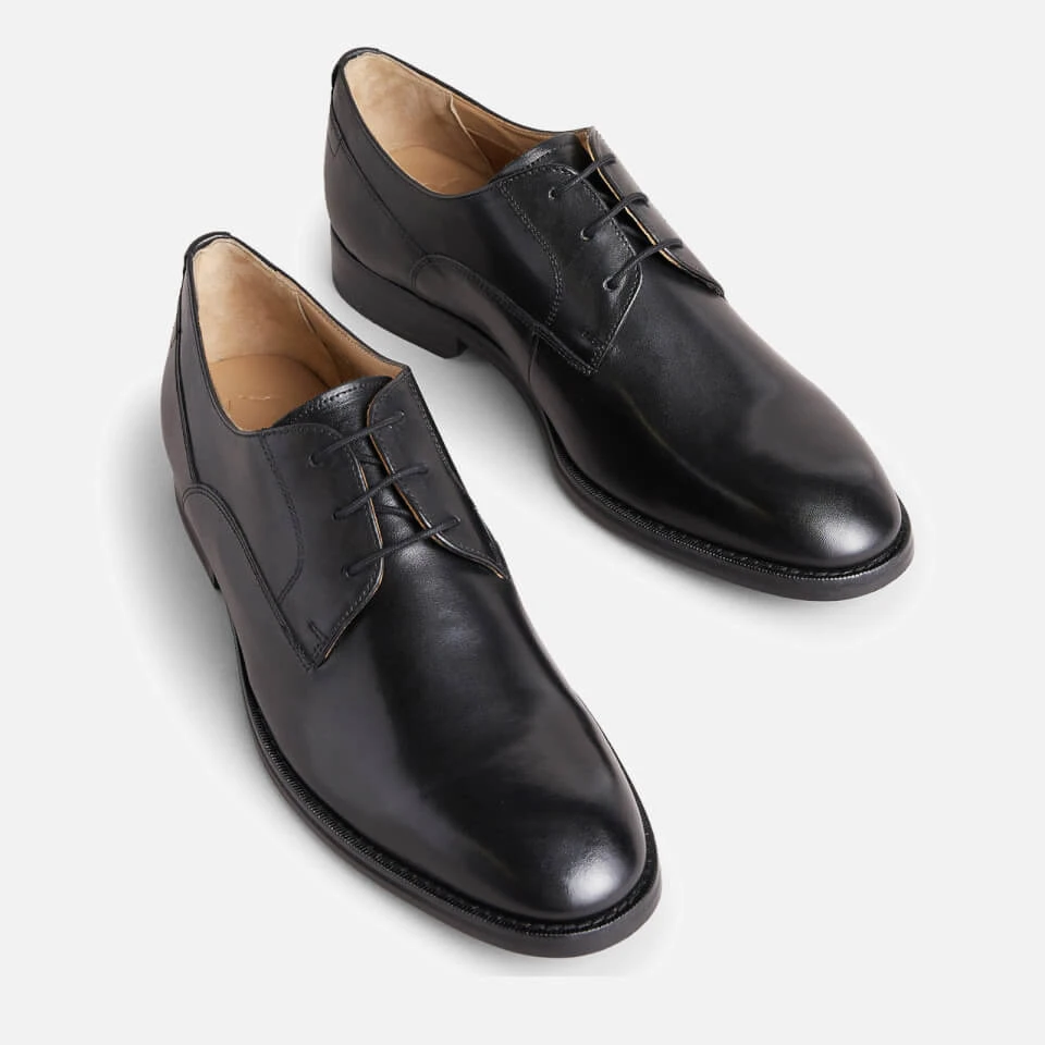- Debossed flower logo, almond toe, stacked heel, black resin soles