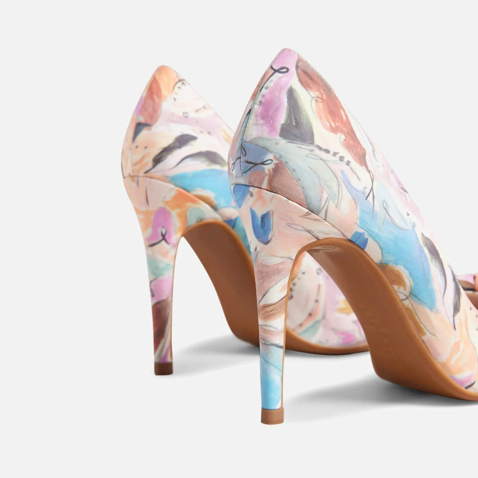 - Floral art print, bow embellishment, pointed toe, stiletto heel, gum resin soles