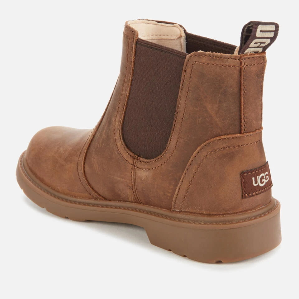 A brown leather kids’ UGG Chelsea boot. The ‘Bolden’ style is waterproof and is fortified with sealed seams to provide premium protection during activities in light-to-moderate weather conditions. Antimicrobial lining keeps feet fresh and a cushioned footbed aids comfort. Gusseted, elastic side gores allow easy entry, assisted with the heel pull tab on the rear. The thick rubber sole delivers durability and enhances traction for a sturdy, non-slip step. An UGG logo patch is stitched on the back of the heel.