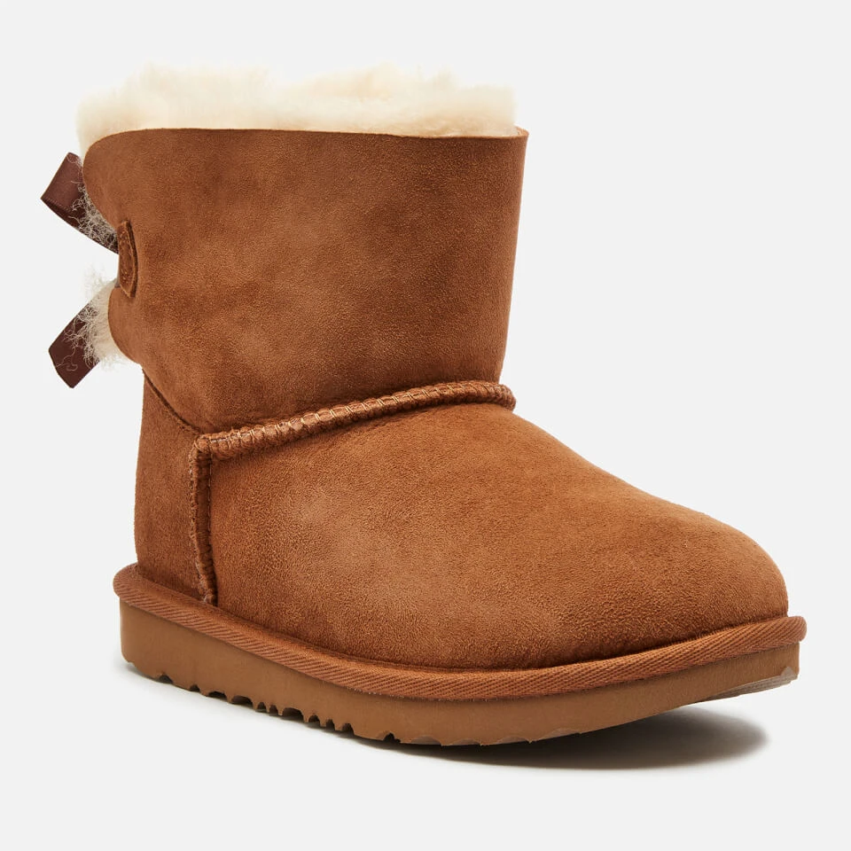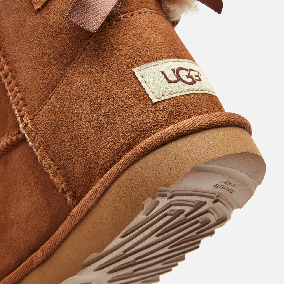 UGG Kids’ boots featuring a chestnut brown suede exterior and cosy sheepskin lining. Finished with a decorative bow to the heel.