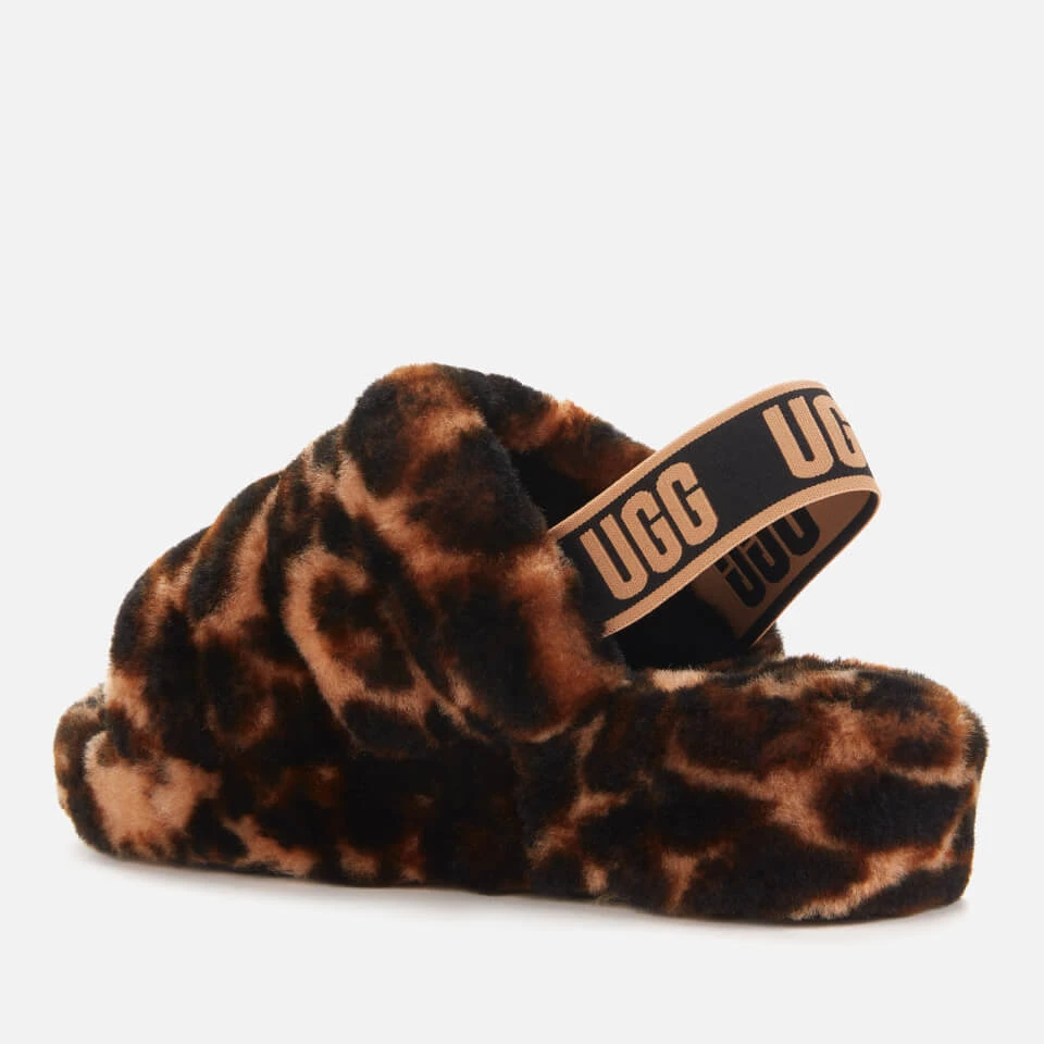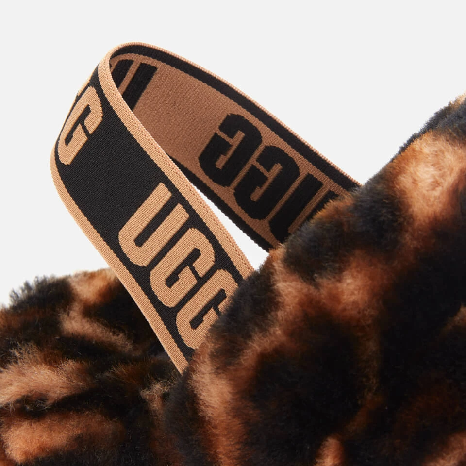 UGG’s Fluff Yeah slide arrives in plush brown sheepskin and is enhanced with a distorted all-over leopard print. It flaunts an elevated sole and a branded heel strap for extra support.