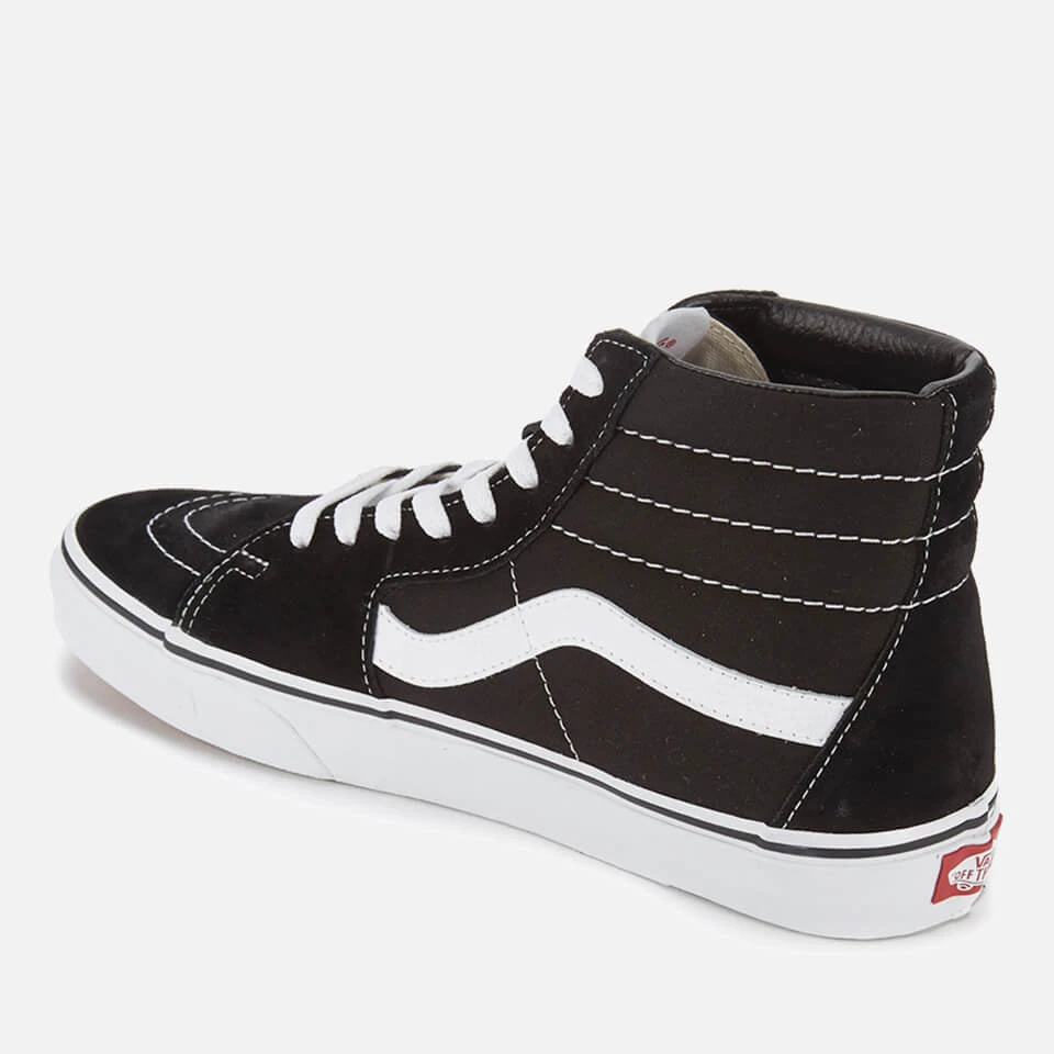 Men’s Hi-Top Vans trainers in black and white. The ‘Sk8-Hi’ style combines retro and modern for a unique appeal. The simple curving white stripe detail accentuates the stitching and the thick white cotton laces threading through seven eyelets. The Vans ‘Off the Wall’ logo crowns the tongue and the rear of the sole, which features Vans’ trademark waffle tread bottom. A padded collar and footbed ensure maximum comfort while the thick white rubber sole includes a vulcanised midsection to make these Hi-Top trainers as durable as possible while still feeling light and flexible and suitable for skaters.