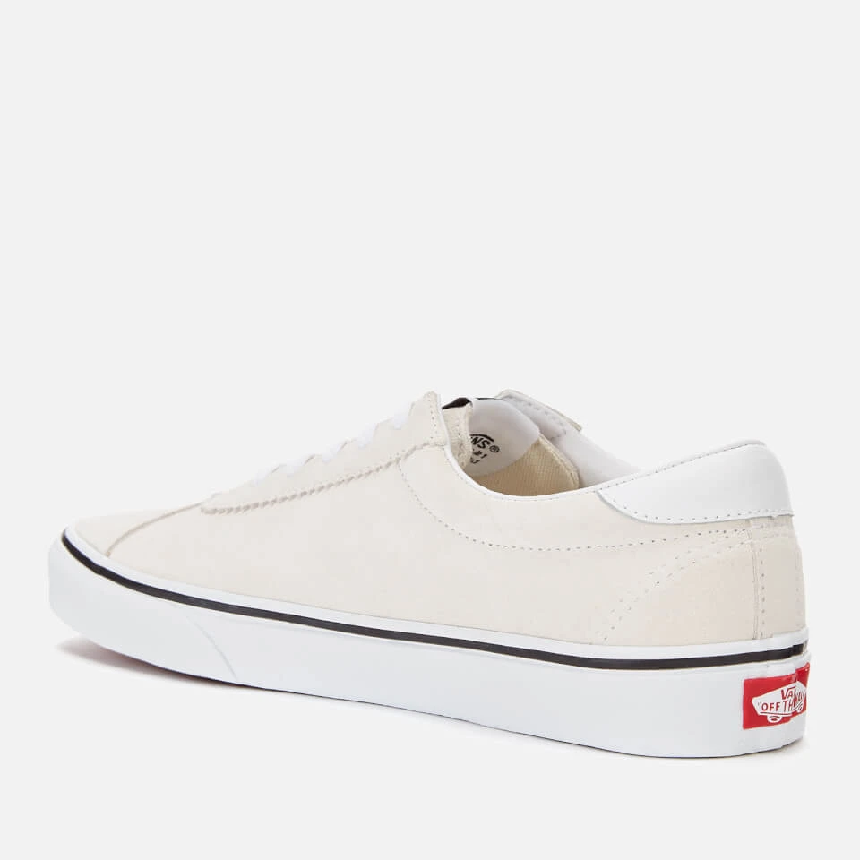 White Vans Sport trainers with a retro design. Smooth suede uppers with old school V side stripes. Lace fastening. White leather detail on the heel. Signature rubber waffle outsole. Logo tab on the tongue. Vans ‘Off the Wall’ detail on the heel.