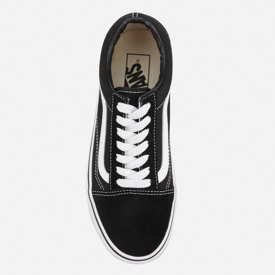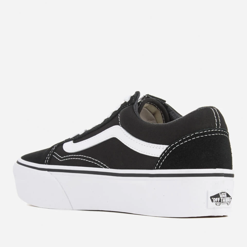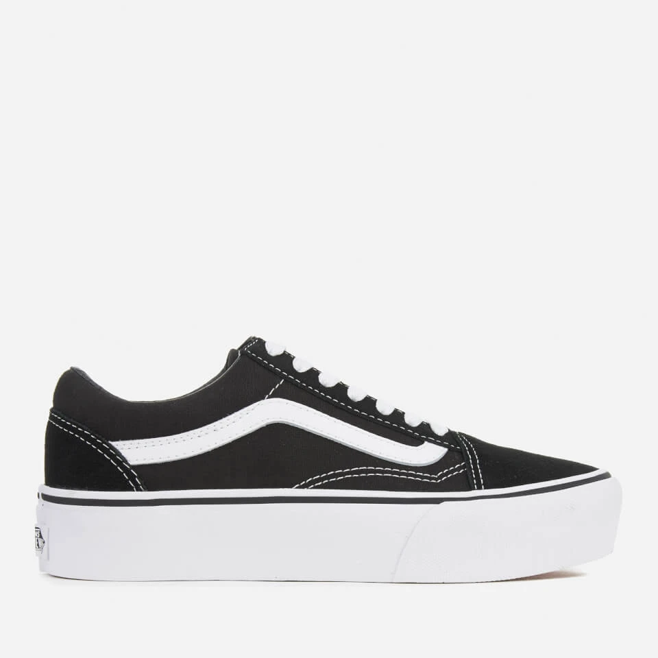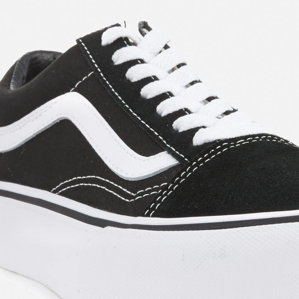 Vans ‘Old Skool’ black trainers with a platform sole. Crafted with suede and canvas uppers, the low top sneakers comprise a rounded, reinforced toe cap and a lace up fastening with flat, white laces.