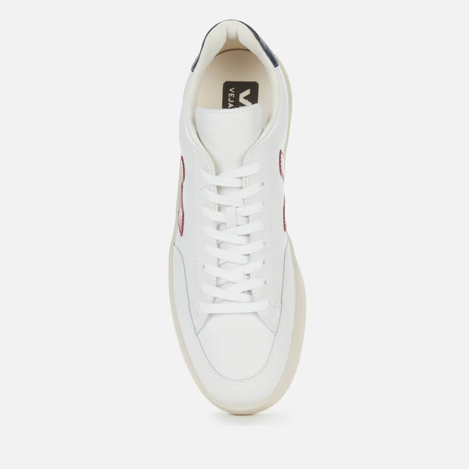 Men’s ‘V12’ trainers by Veja. The low-top trainers are realised in a bright white colourway, detailed with red and blue panel detail.