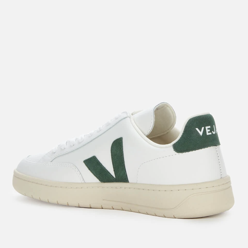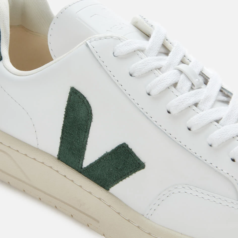 Men’s ‘V12’ trainers by Veja. The low-top trainers are realised in a bright white colourway, detailed with forest green panel detail.
