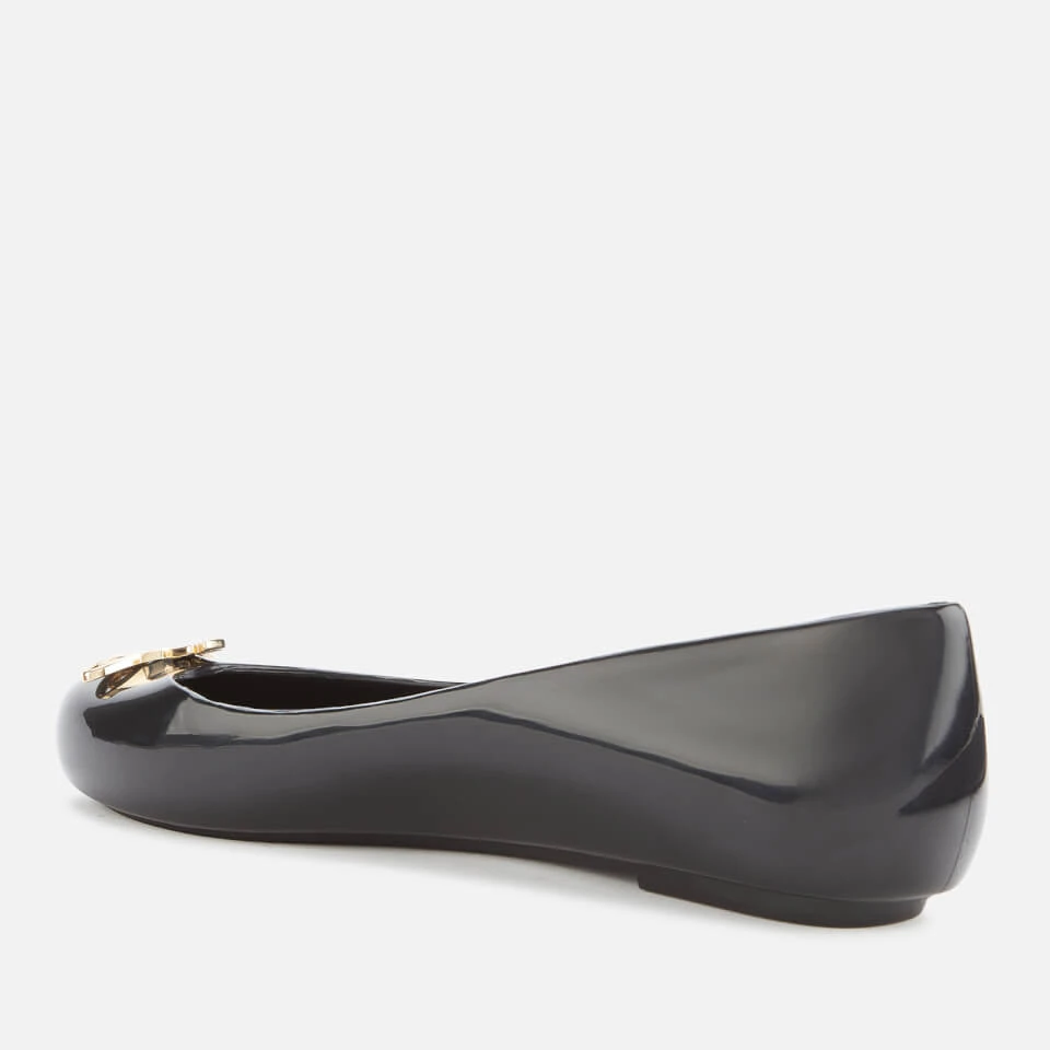 ‘Space Love’ ballet flats from Vivienne Westwood. Crafted from durable PVC, this simplistic design is decorated with a signature Westwood Orb, realised in gold-tone metal. Set upon a cushioned footbed, finished with branding and detailed with a gripped sole.