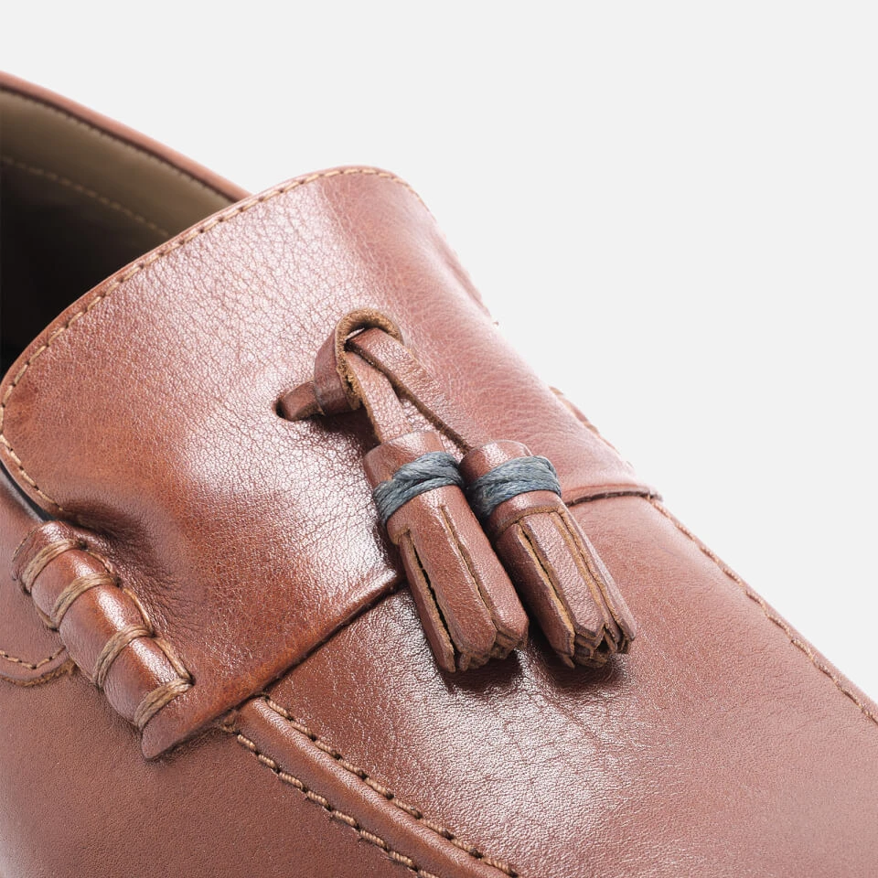 - Tassel detail, leather back strap to the heel, tonal stitching